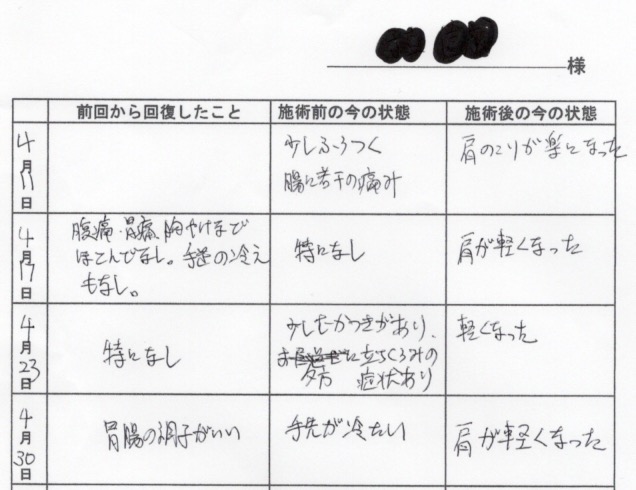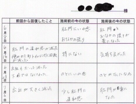 2    3回までお腹に効果が無かったが、4回の施術で血便が大きく減って来た。