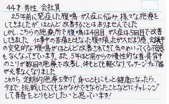 私は仕事中のガスや腹鳴りで悩んでいましたが、ホームページで研究所を知り施療に行きました。1回の施療の翌日から昼食後に増えるガスが激減しました。その後3日続けてガスは増えませんでした。2回目では仕事中、1日を通してのガスも楽になりトイレに駆け込んでガスを出す事も無く楽になり4回でお腹の張り、ガスの出過ぎ、腹鳴りの症状がほとんど改善して、その後は全快状態となり仕事に集中出来るようになりました。本当にありがとうございました。※施療効果には個人差があります。