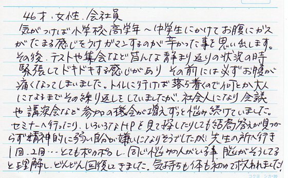 気がつけば小学校高学年~中学生にかけてお腹にガスがたまる感じを受けガマンするのが辛かった事を思い出します。その後、テストや集会など皆んな静まり返りの状況の時、緊張してドキドキする感じがあり、その前には必ずお腹が痛くなってしまいました。トイレに行けば落ち着くので何とか大人になるまで、その繰り返しをしていましたが、社会人になり会議や講演会など参加の機会が増え、ずっと悩み続けていました。セミナーに行ったり、いろいろなHPを見て探したりしても結局答えが見つからず、精神的に弱い自分が嫌いになりそうでしたが、先生の所へ行き、1回、2回・・・とてもポカポカし同じ悩みの人がいる事、脳がそうしてると理解し、どんどん回復してきました。気持ちも体も初めて救われました!